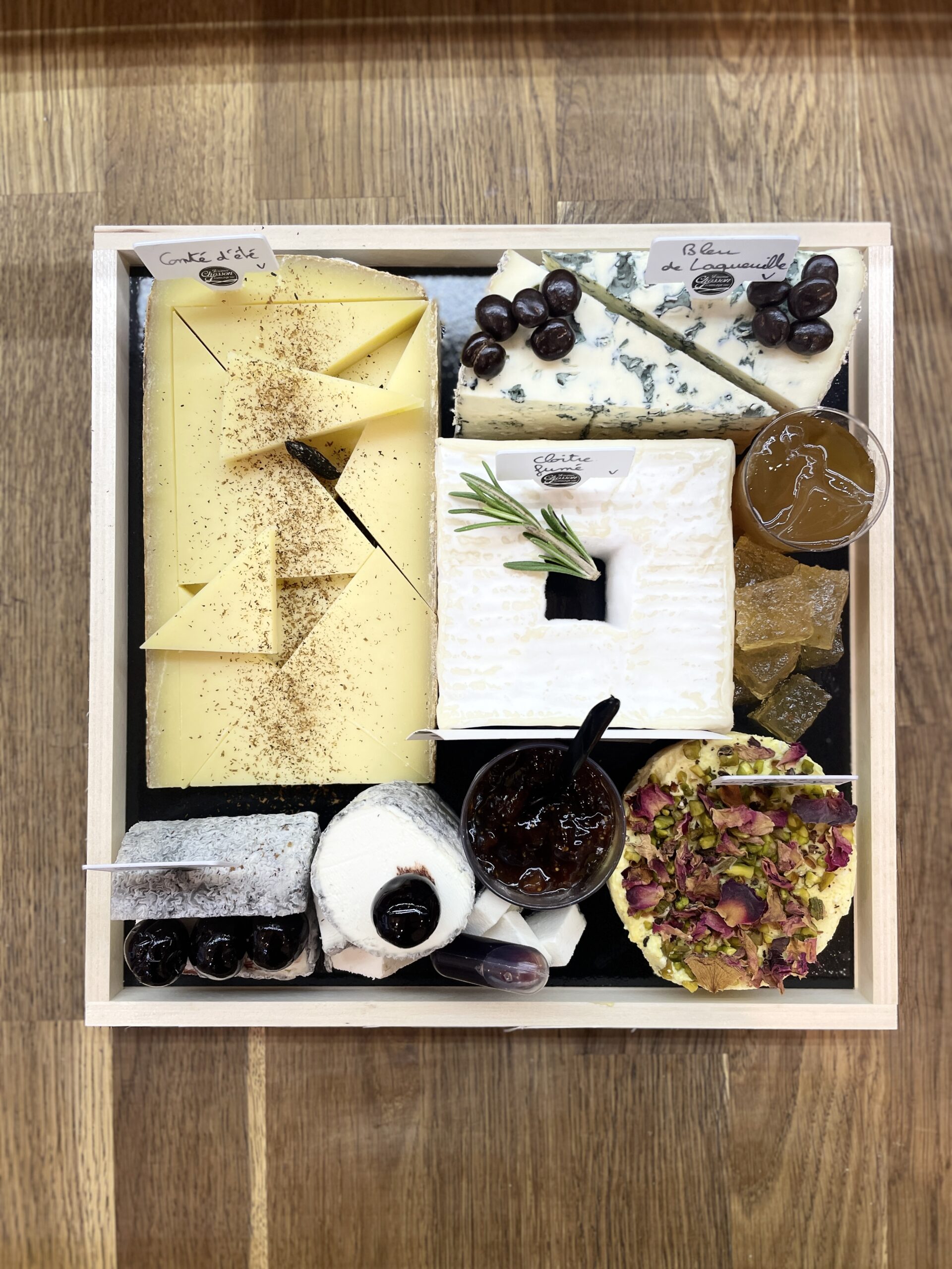 Dans son joli coffret en bois, nous mettons en scène une sélection de fromages du moment. Des découpes et des présentations originales sont réalisées pour créer l’évènement lors de votre repas.