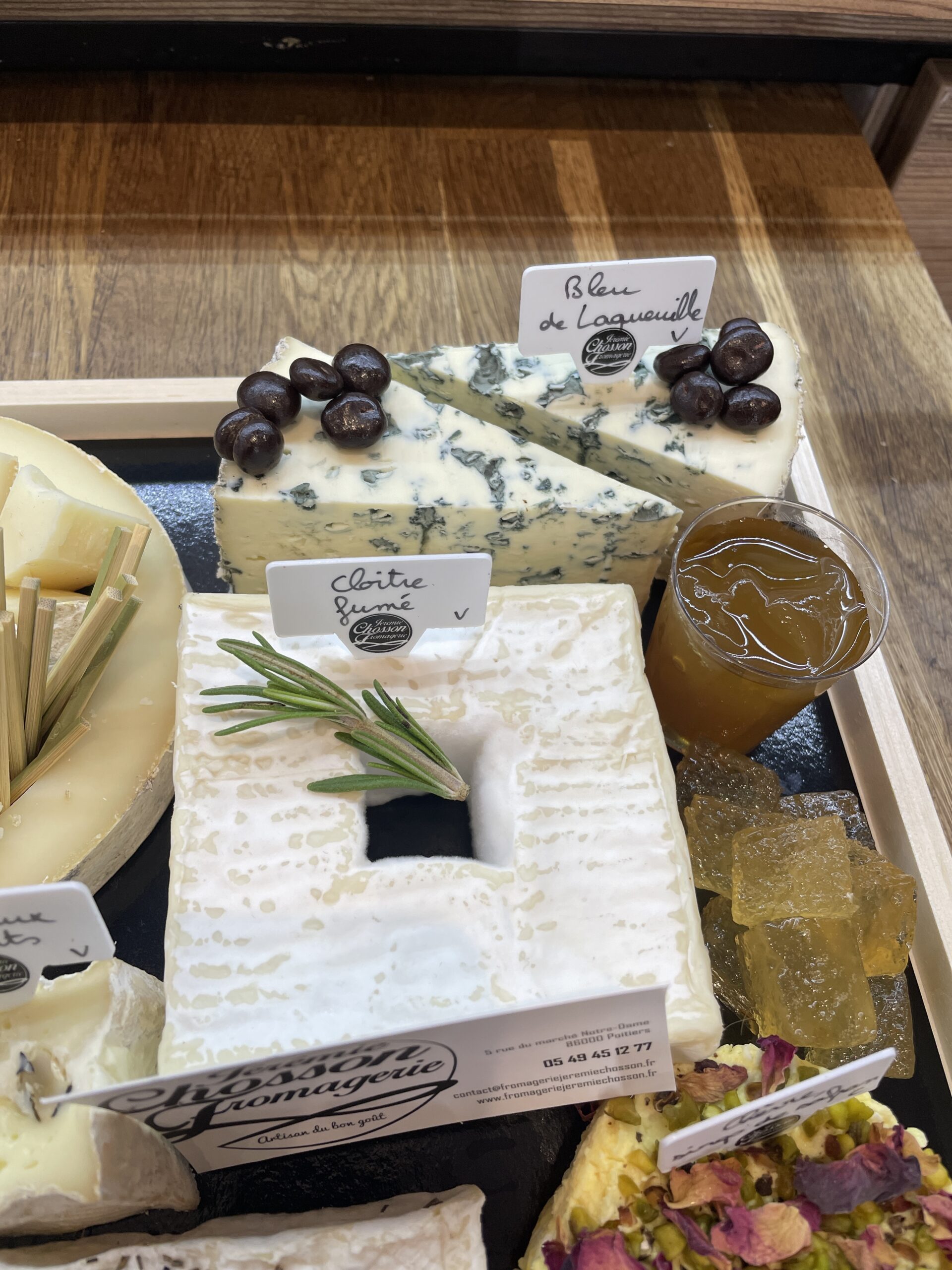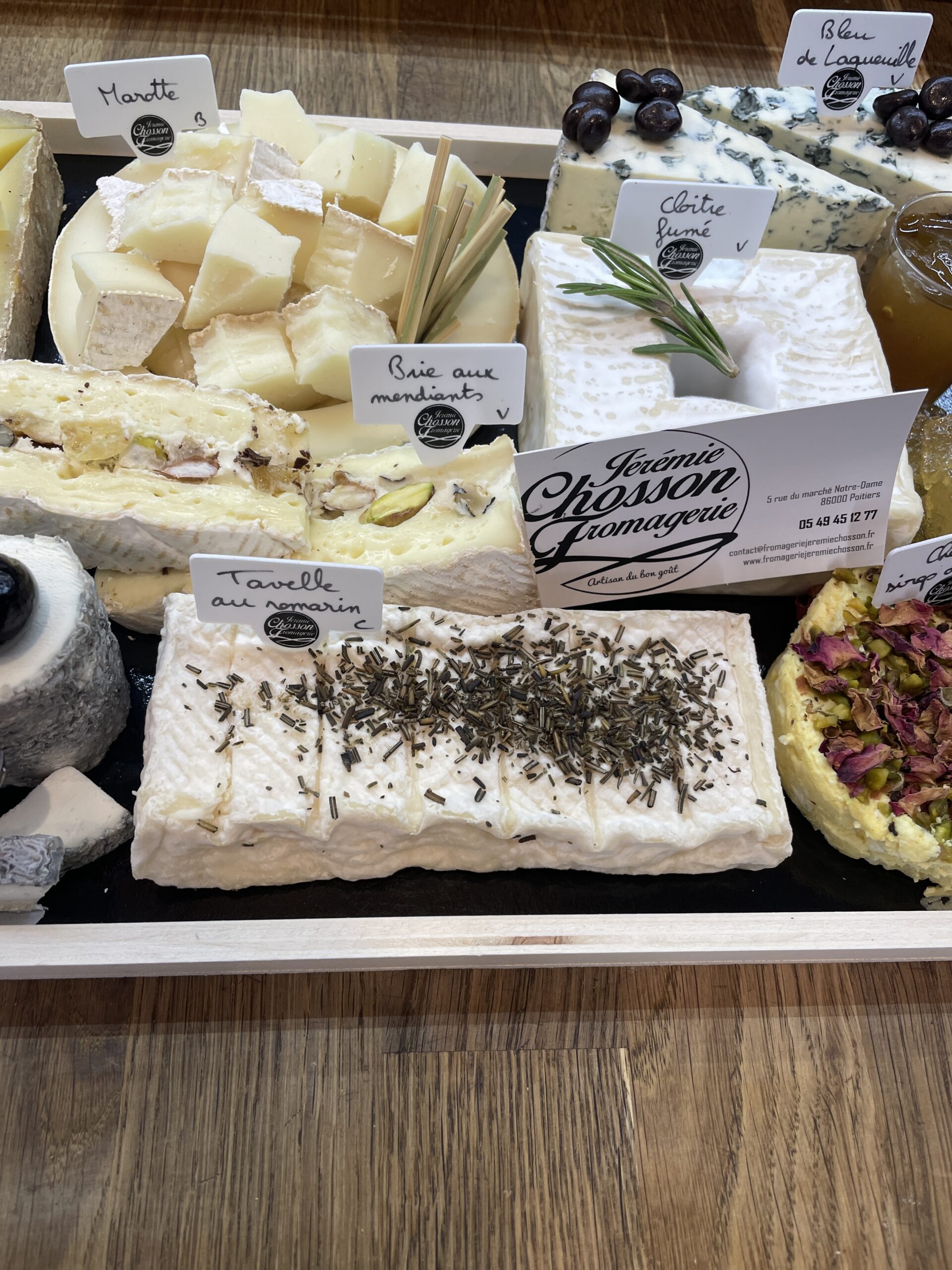 Composition du plateau : toujours deux classiques de nos plateaux des fêtes : un Comté de l’été 2024 et un fromage de chèvre de la région, une bûchette cendrée de Largeasse. Cette année, un fromage/création surprise viendra vous étonner. Il s’agit d’un chèvre frais mêlé à un sirop de safran, éclats de pistaches et pétales de roses.