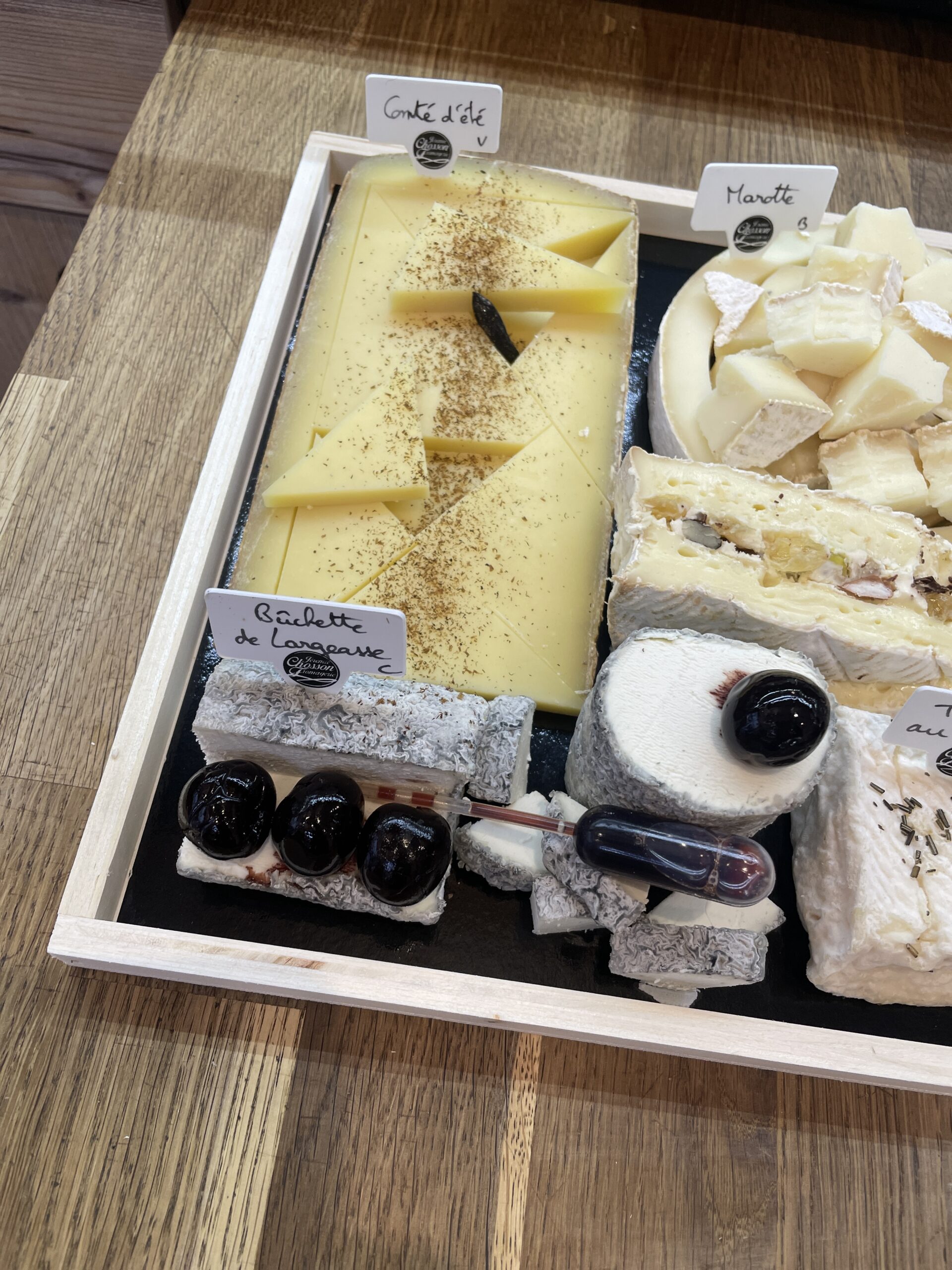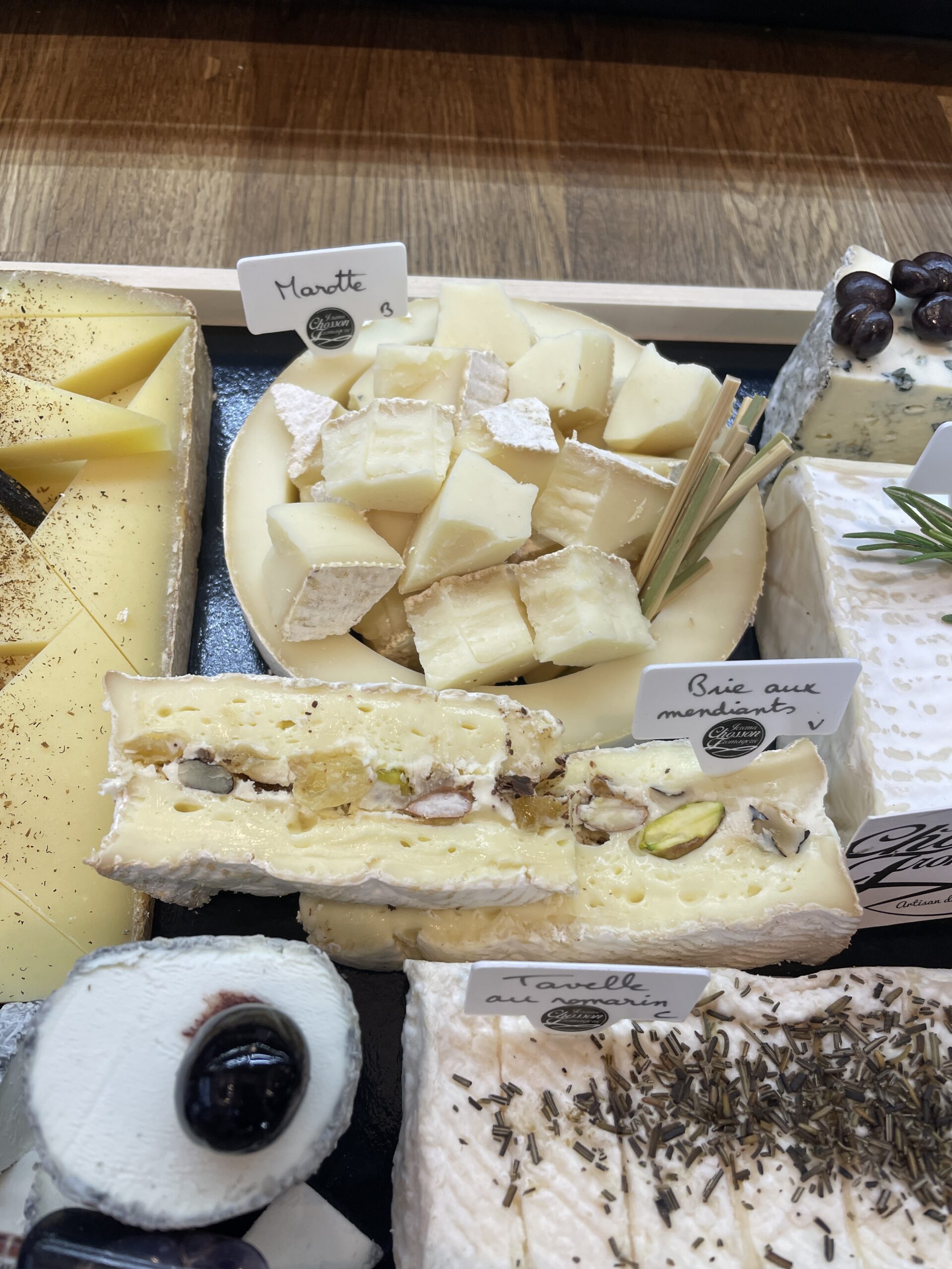 Sur le grand plateau, trois fromages sont ajoutés : un brie façon mendiant comprenant chocolat et fruits secs (pistaches, figues, raisins, noix, amandes), une Tavelle au romarin (un fromage de chèvre crémeux) et de la Marotte, une tomme de brebis particulièrement fruitée.